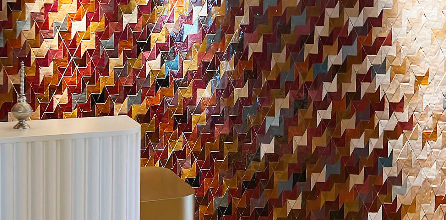 Samir redécouvre le zellige de son enfance à Tétouan et explore les possibilités géométriques du zellige, singulier carré de terre cuite. Il cherche à créer un nouveau langage esthétique, détaché de la tradition mais ancré dans sa force spirituelle et la culture. Dans son atelier à Toulouse, il transforme l’espace du carré en un terrain d’expérimentation. Une nouvelle poésie géométrique émerge, mêlant origami, minimalisme et formes infinies. Chaque carreau, découpé en motifs géométriques, peut être réagencé comme un tangram, répété comme une séquence musicale colorée, avec des notes inattendues. Ces surfaces, apaisantes par leur répétition et surprenantes par la répartition des couleurs issues du nuancier traditionnel, créent des histoires sensibles. Pour Samir, elles sont avant tout une perception de la lumière, au-delà de la matière. Chaque fragment de zellige étant unique, il réfléchit la lumière en fonction des aspérités, des émaux, des nuances, des textures, de sa découpe, et bien sûr, en fonction de la luminosité qu’il capte avant de nous la renvoyer.