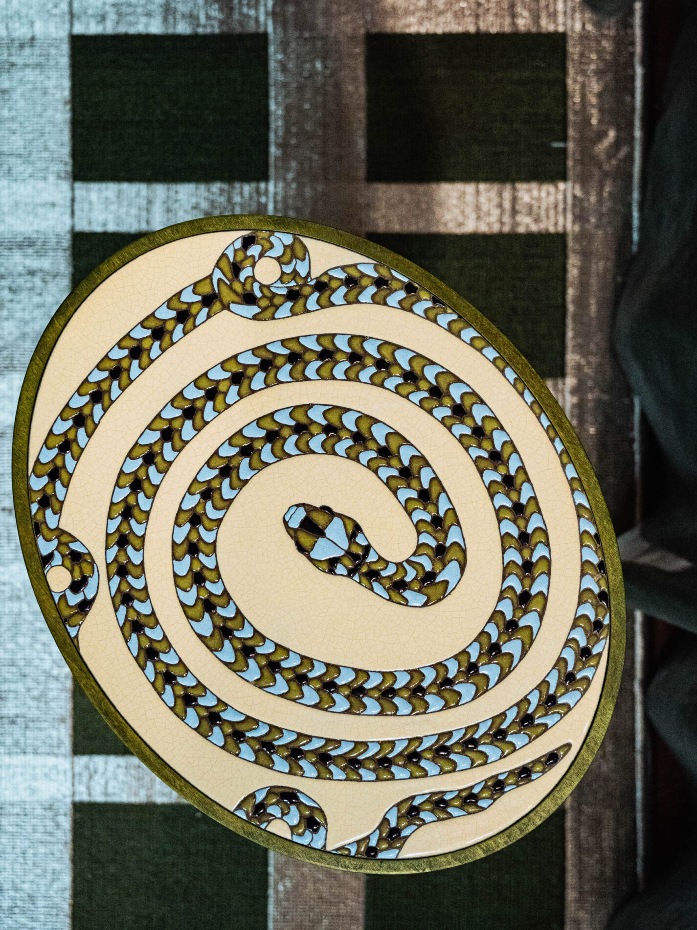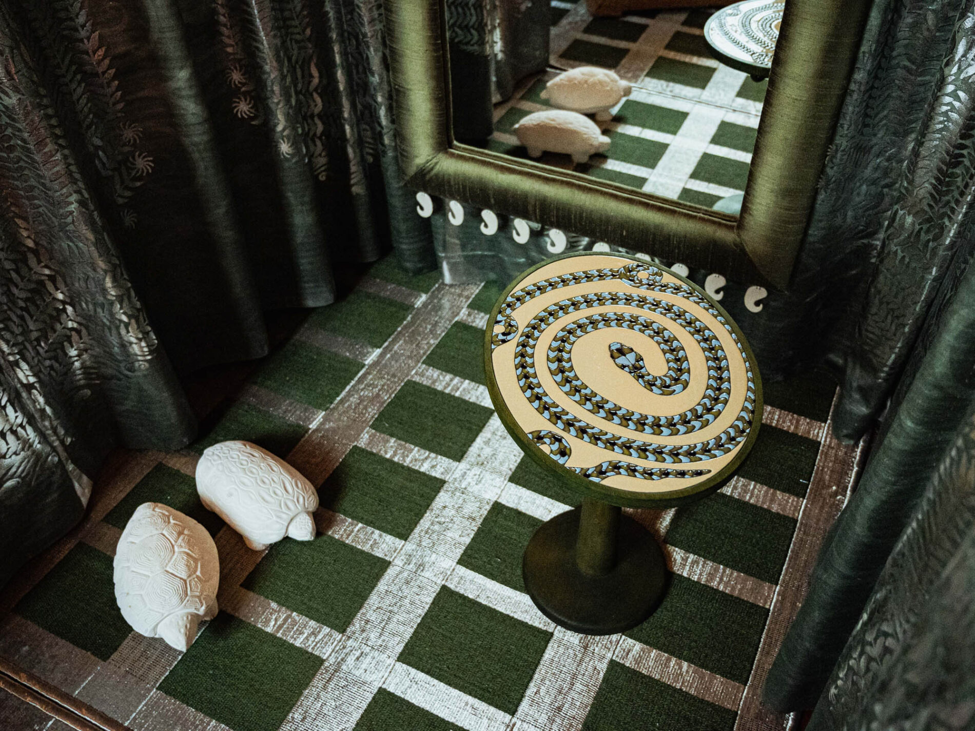 Table noir et blanc – Tristan Auer | Table serpent – collaboration ft. Léa Zeroil | Poignées – Métiers rares/Raphaëlle Le baud | Vase – collaboration ft. Victor Cadène | Détail table – Nouveau Standard | Plateaux noirs (galerie) – RDAI | Revêtement (galerie) – Mobilier National | Revêtement (galerie) – Lizée Hugot