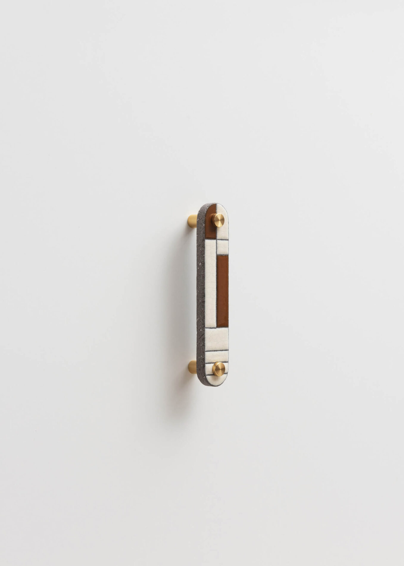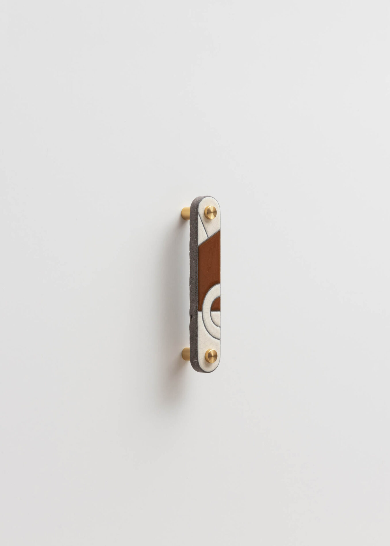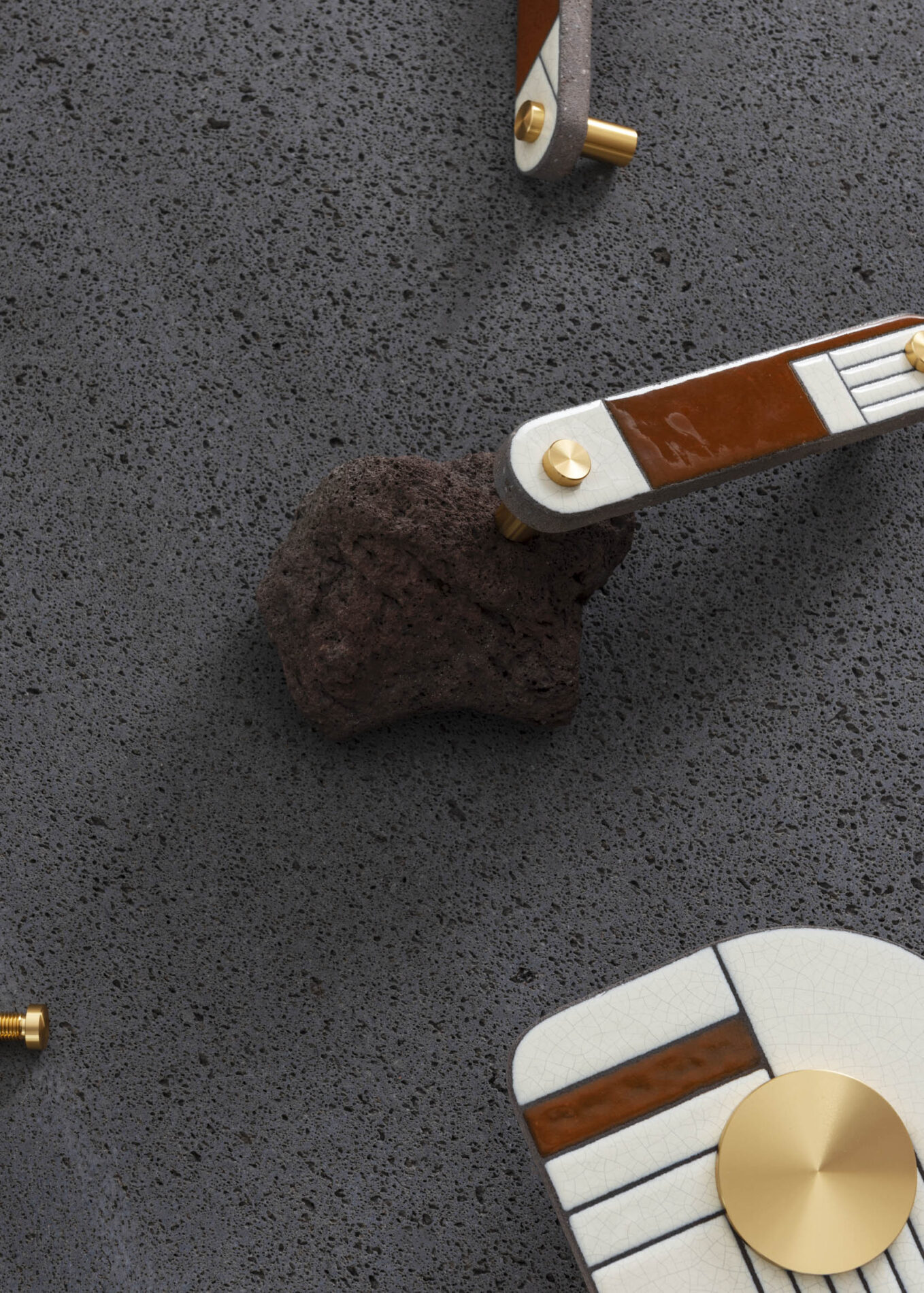 selon ses grains et bulles. Vient ensuite l’étape du débitage, qui lui donne sa forme définitive. Les couleurs sont développées spécifiquement pour chaque projet — comme pour les poignées réalisées pour Elliott Barnes Interiors,