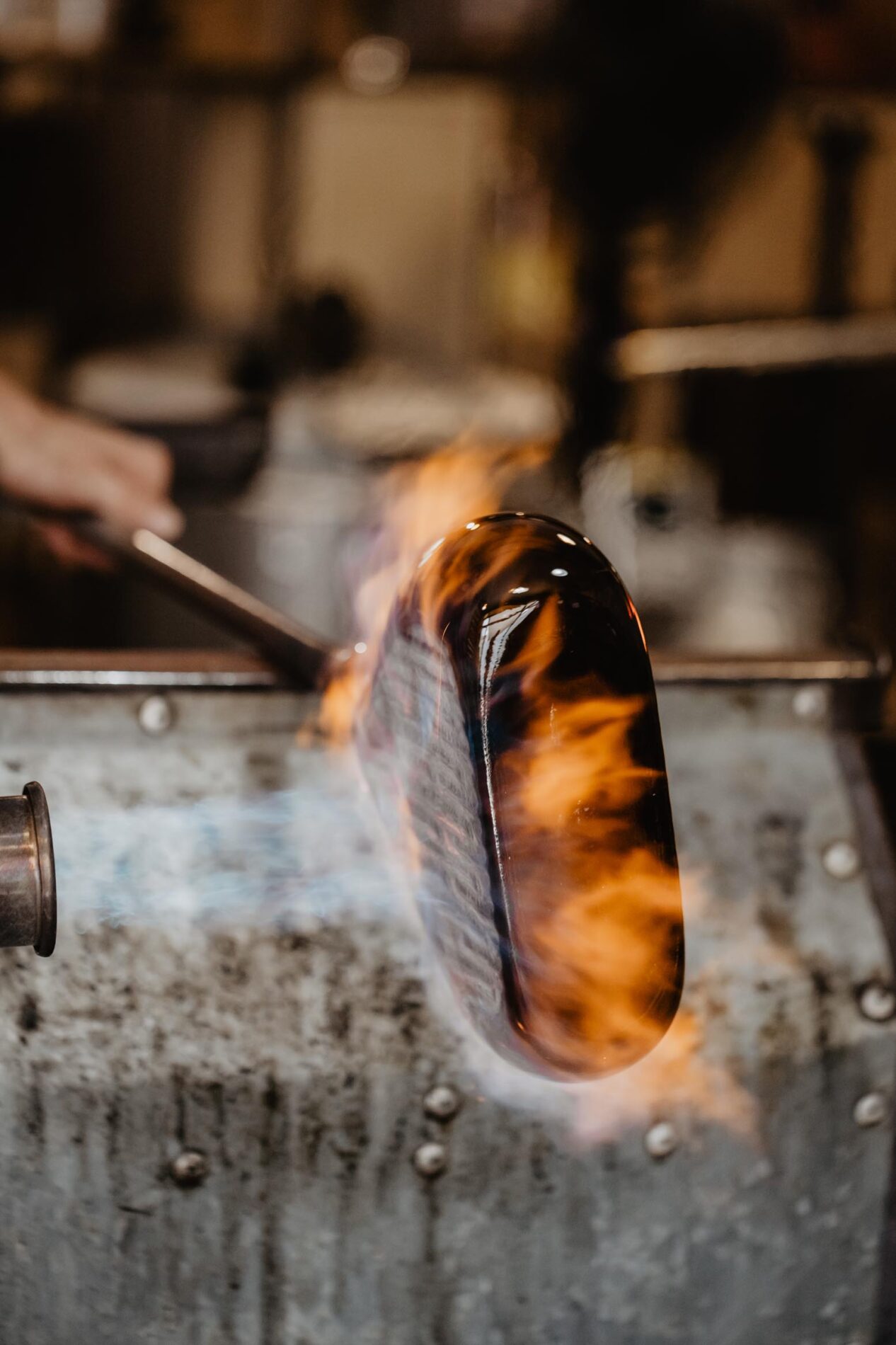 Dans son atelier, la lumière de la flamme devient matière, et le souffle se fige en pièces uniques à poser, luminaires,