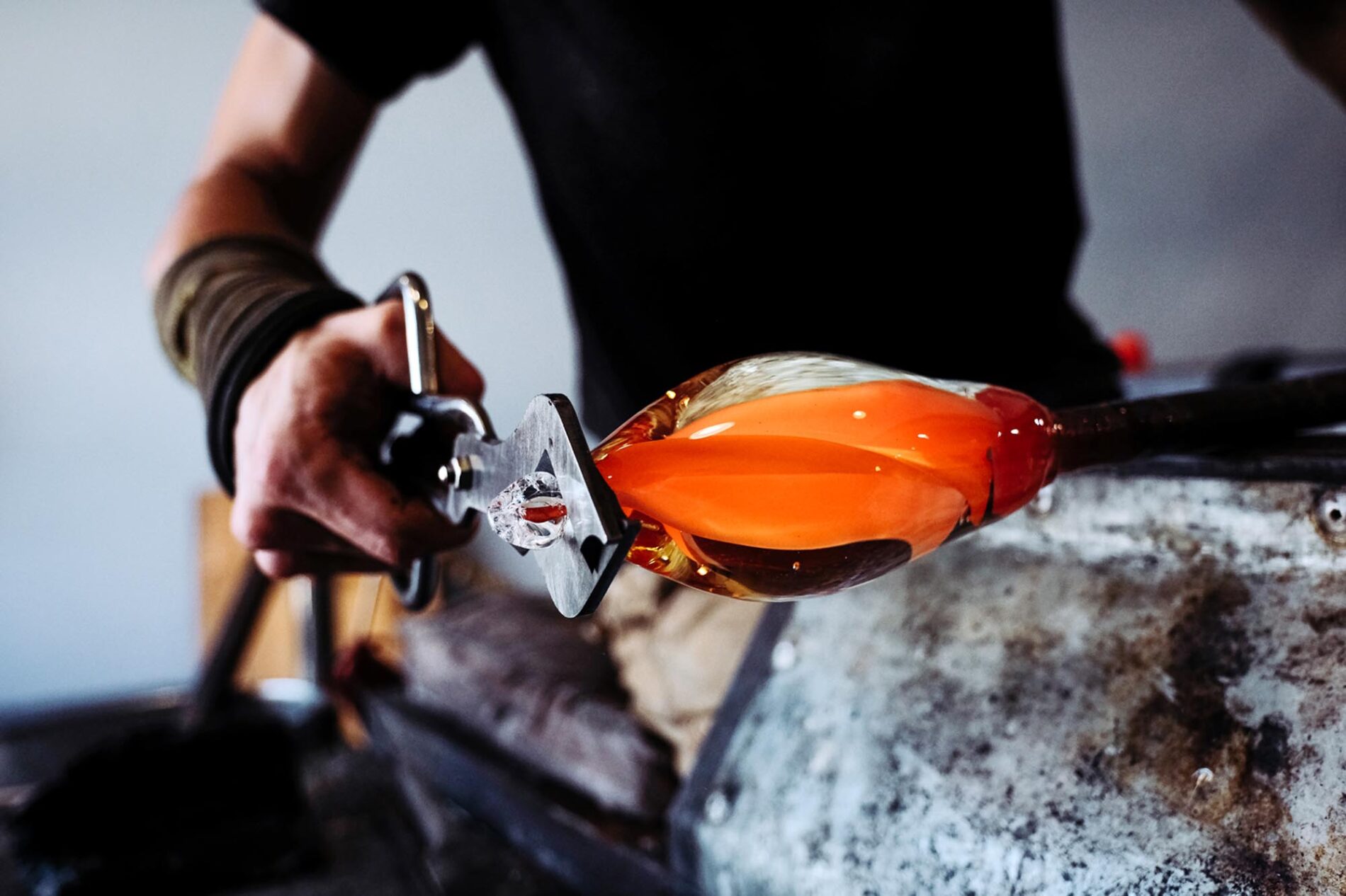 Créateur d’art verrier et designer, Thibaut Nussbaumer fait danser l’impalpable verre en fusion.